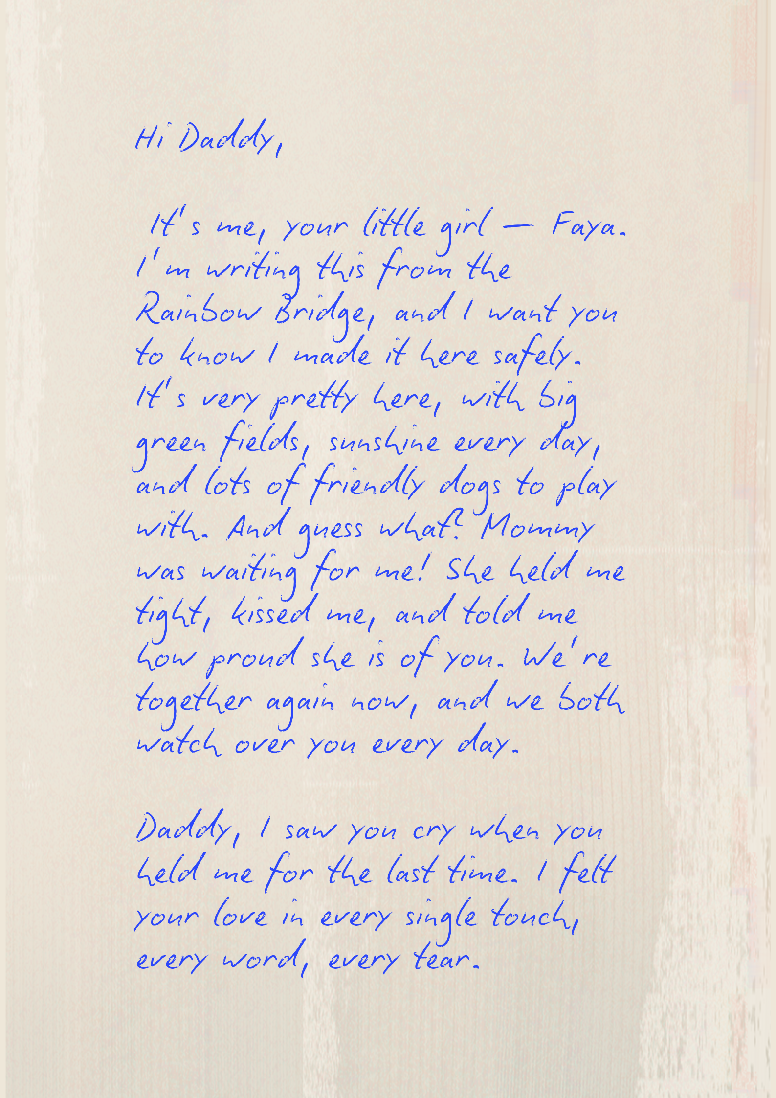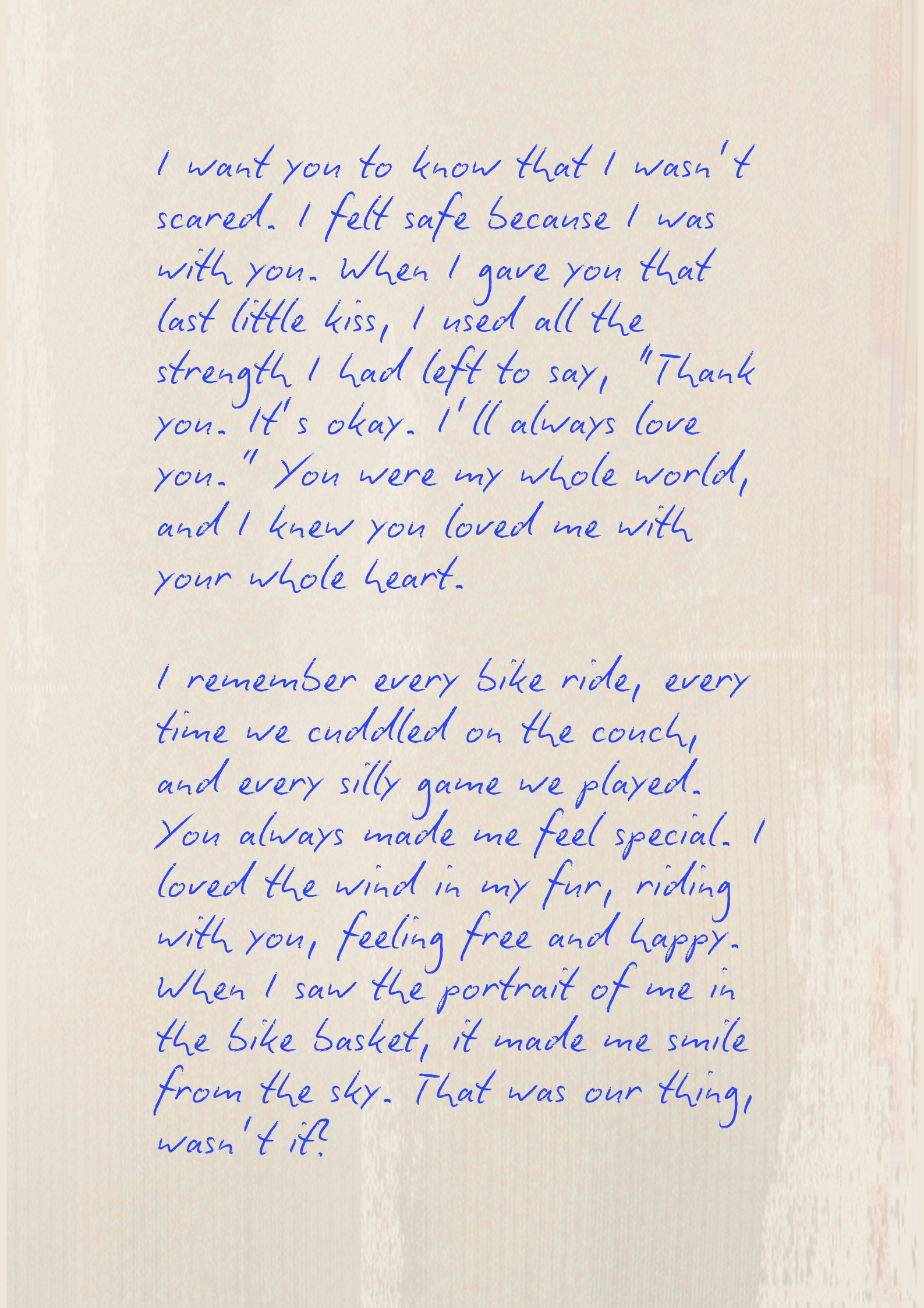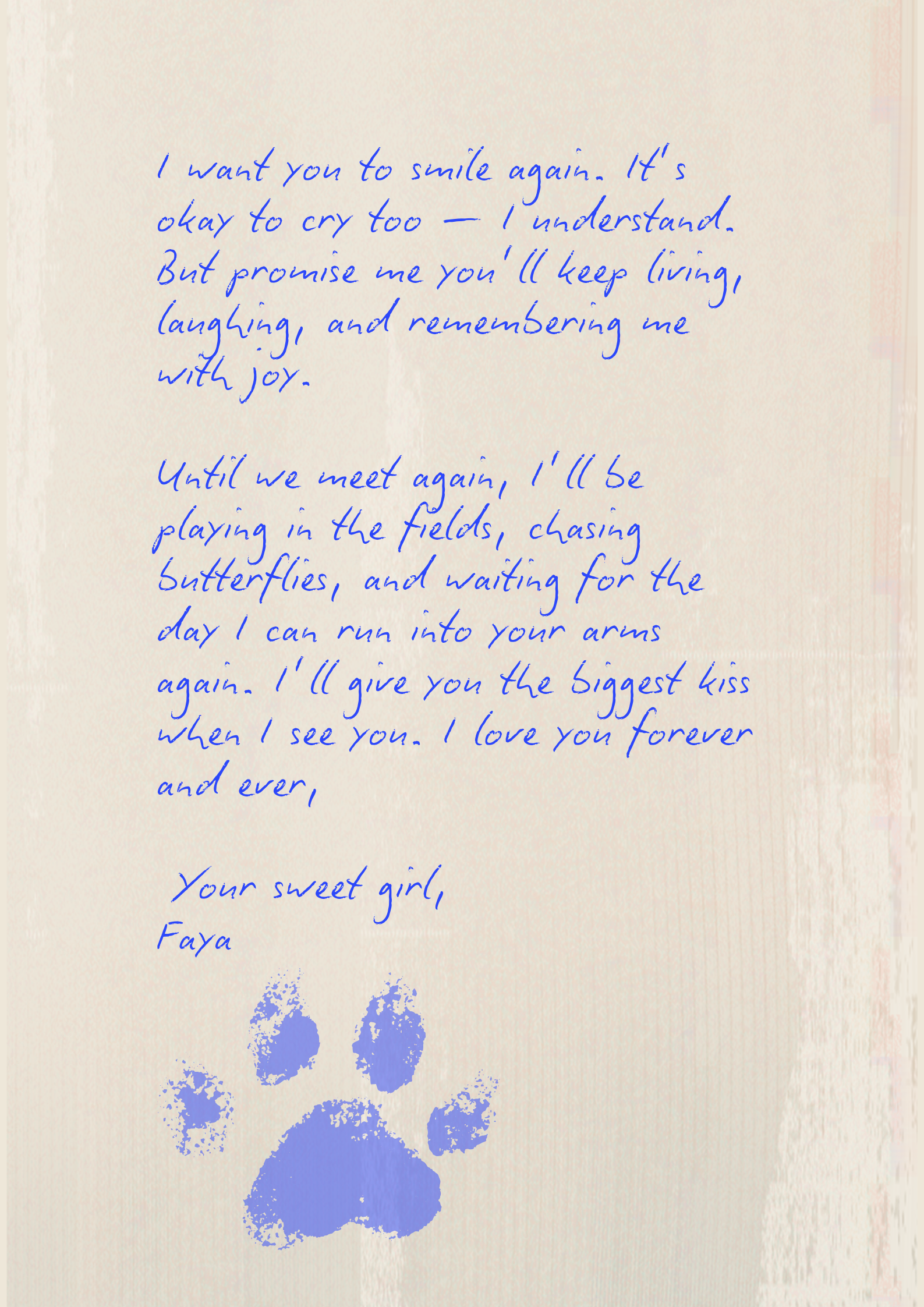Whether they were your shadow, your smile, or your soulβs best friend, this letter becomes a cherished voice from beyond, offering healing and peace in your time of grief.